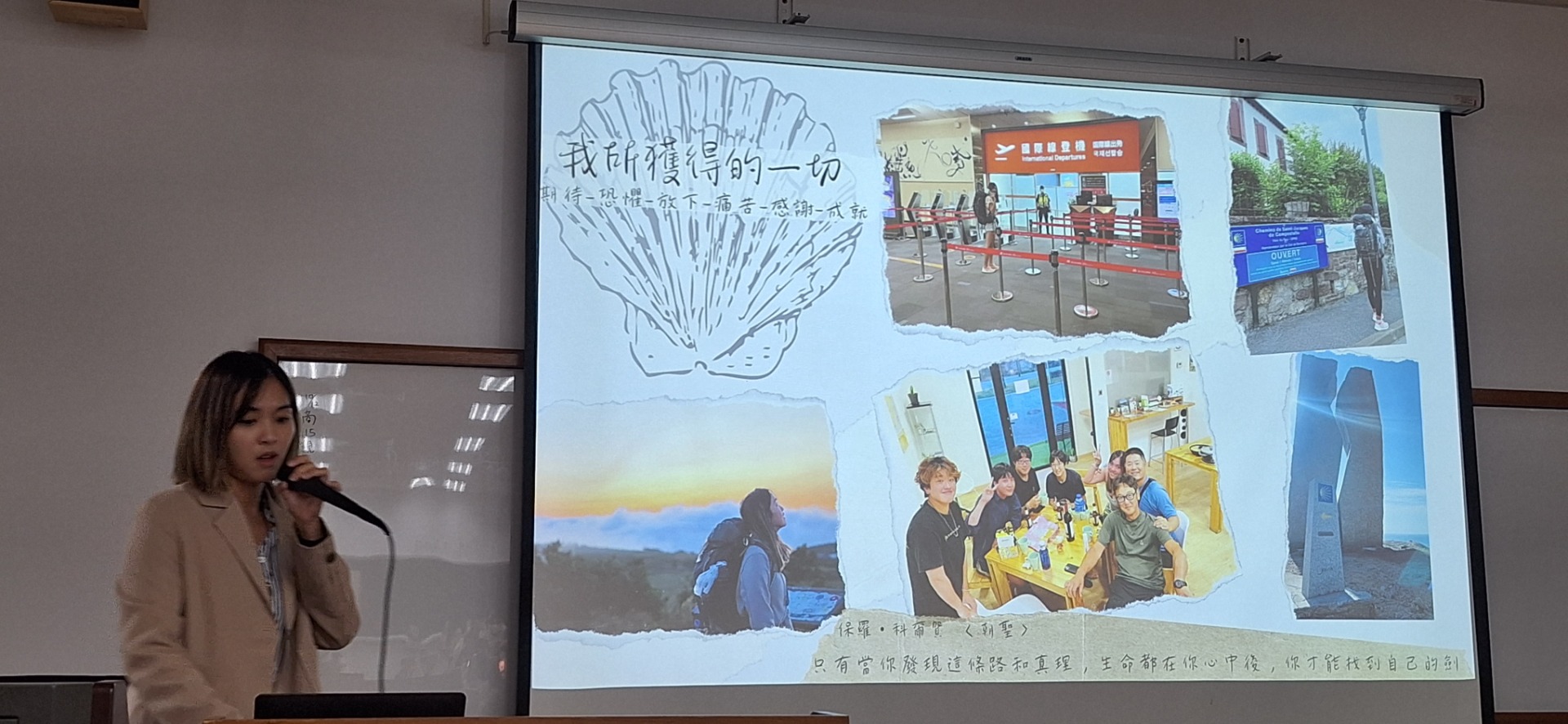 生命教育 藍舶銓 1.請寫下3句你聽到的金句 2.請寫100字聆聽演講心得 1. 朝聖之路就像人生 2. 一切在非尼斯特雷結束一切在穆希亞重生 3. 把握大學生活 朝聖之路的演講對於人生意義的變革影響深遠,其中有四失,才讓大家走向這段艱辛的路程,然而講者在這段路程中,有苦有笑,原本的想法是自己探尋,結果在這段旅程卻結交了許多共同扶持的朝聖者,例如:講者在路上扭到腳踝,甚至摔了一跤,被至少四個以上不同族群的人們幫助(還有老伯伯)。在現實生活中的苦悶,在路上捨不得的情緒中釋懷了。在這段路程,自由度挺高,就如同人生一樣,做決定還是在於自己。 在路程,橫跨西班牙這段,我從講者身上學到〔讓我們曾經受過的傷,終將長成我們最強的所在,只要抱持一顆想完成的心,一定做得到〕。 #總花費:13萬
