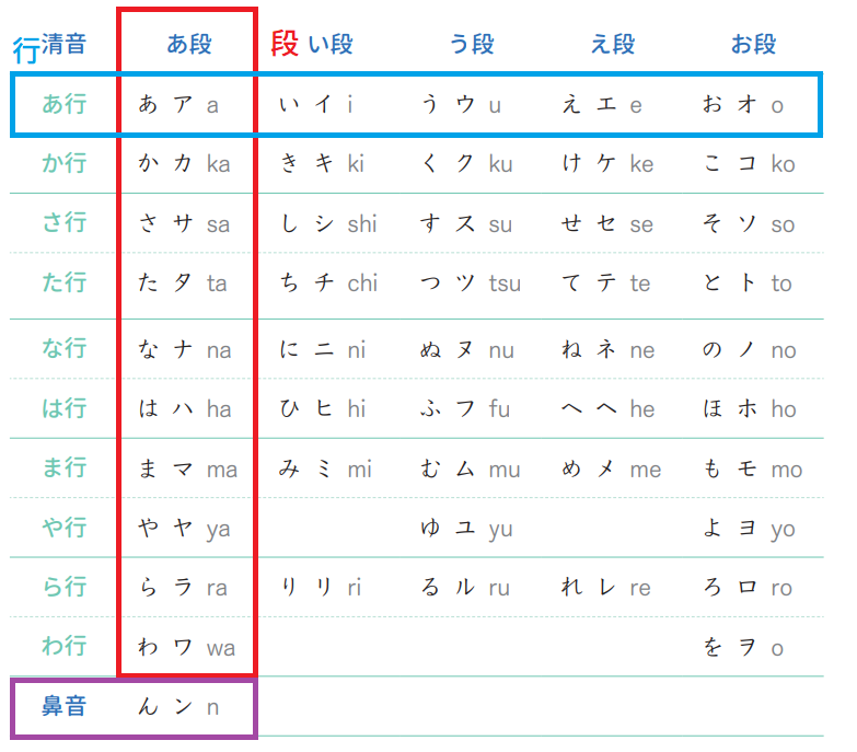 接下來我們來認識「假名」,日文有分平假名跟片假名。下方圖示比較圓潤的字體,我們稱為平假名,比較方正的字體稱之為片假名。其中あ行的あいう えお(a i u e o)為母音,其它行則為(k s t n h m y r w)子音,這些行的母音及子音拚在一起就是我們在五十音表上的「清 音 」,而あ行下方多出來的「ん」發鼻音,又稱為「撥音」。在日本,平假名的使用比例其實是比片假平來得高的,這邊建議初學的同學們,先從平假名開始學習,並以「行」為單位來朗讀及默背。例:あいうえお、かきくけこ、さしすせそ……。以下就提供幾個五十音練習方法供大家參考。
