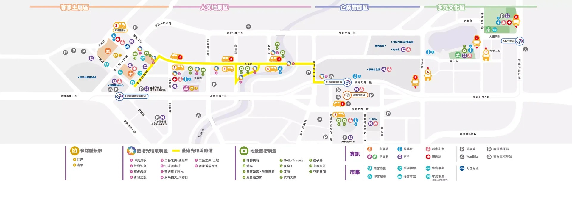 「2023世界客家博覽會」的展區位於桃園靑埔,以機場捷運、高鐵站為圓心,作為世界接軌的核心區,串連老街溪水文流域、埤塘與靑埔新市鎭的都市計畫分區,利用建築都市景觀空間的地理資訊系統,疊合當代生活圖像與場域計畫資源,從「食衣住行育樂皆文化」的概念,挖掘「客家精神潛力點」,進一步在這些點與點,都市建築外的空間與空間中,串連規劃打造成具有人文氣息的「世界客家博覽會新流域」。